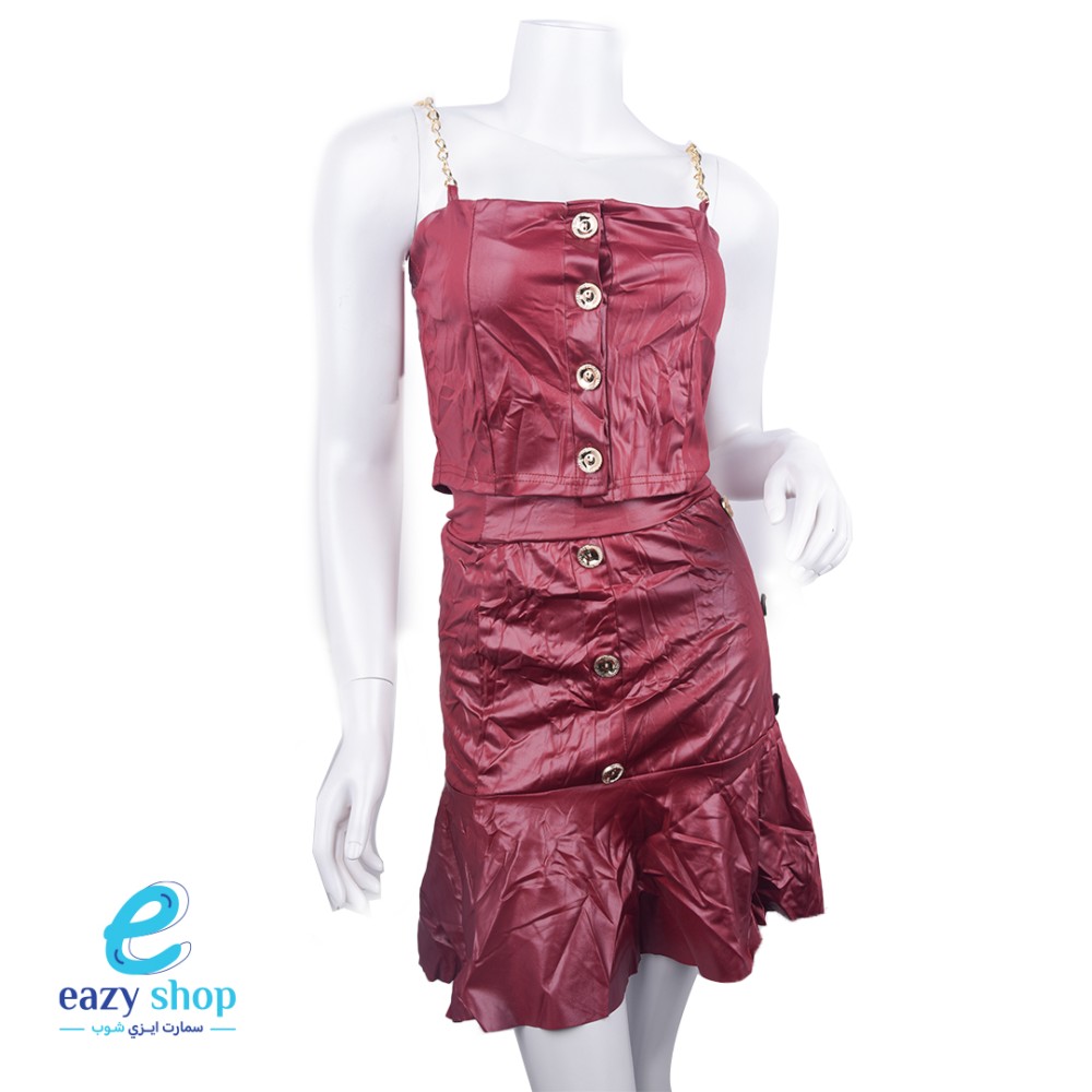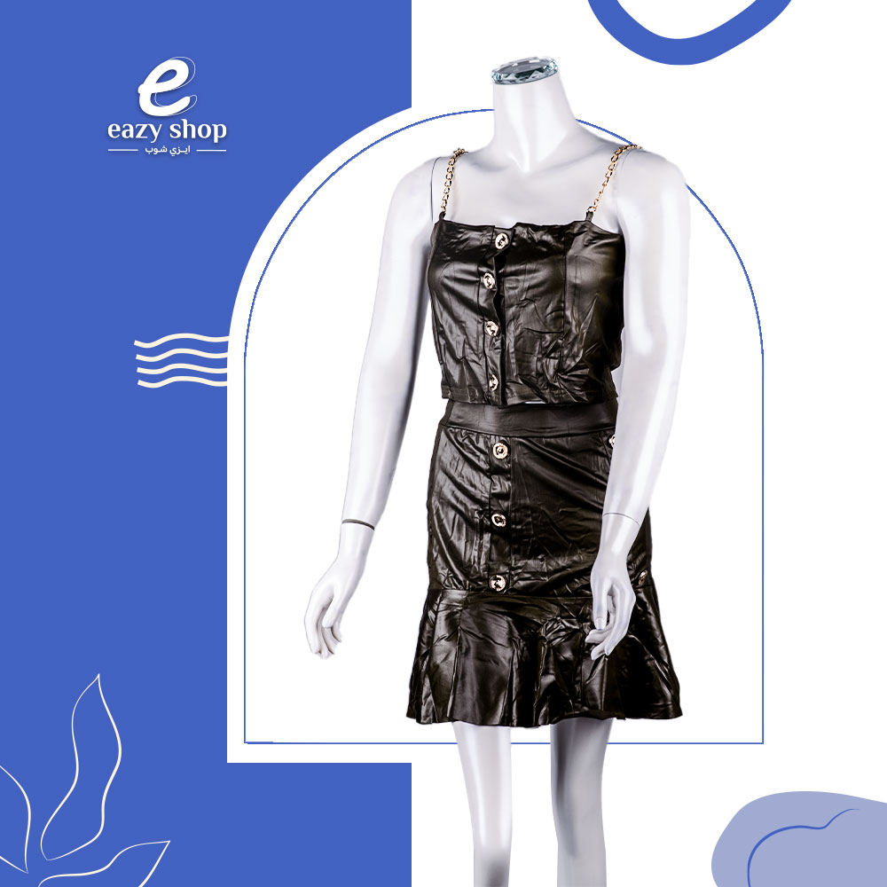 بجامة قطعتين مصنوعة من الجلد تتكون من بلوزة على سلسله في الكتف تعطي لمسة راقية بالاضافة الى تنورة قصيرة ناعمة وخفيفة , موديل عصري بلمسة انثوية يجمع بين الاناقة والراحة متوفر بالوانه المتعددة