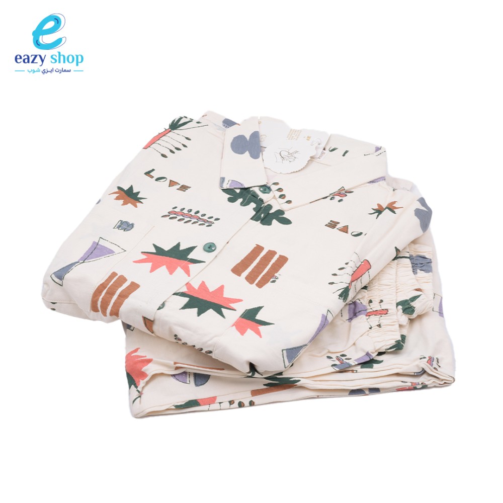 بجامة نسائي طويل من قطعتين البلوزة على ياقة, كم طويل وازرار من العنق للاسفل , البنطلون طويل على خصر مطاطي يعطي راحة وحركة مثالية , تتميز باشكال ورسومات مختلفة تعطي طابع رائع