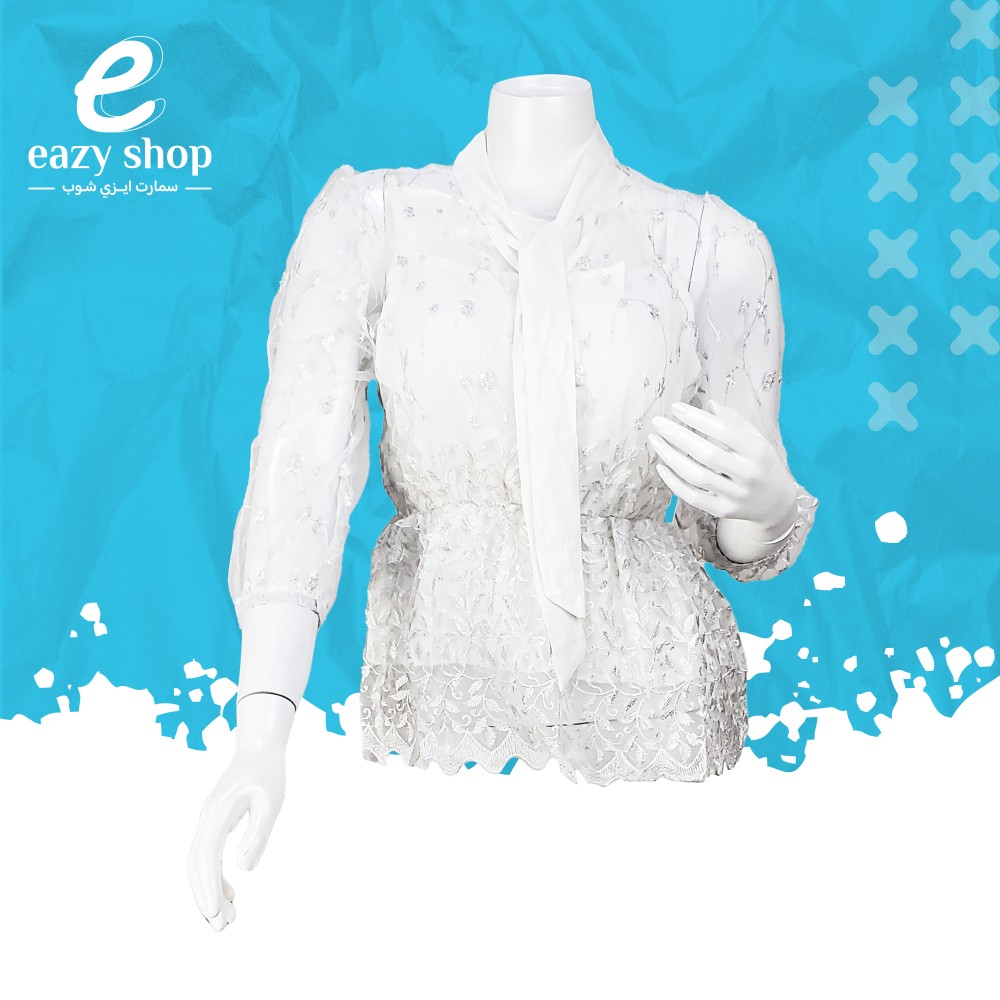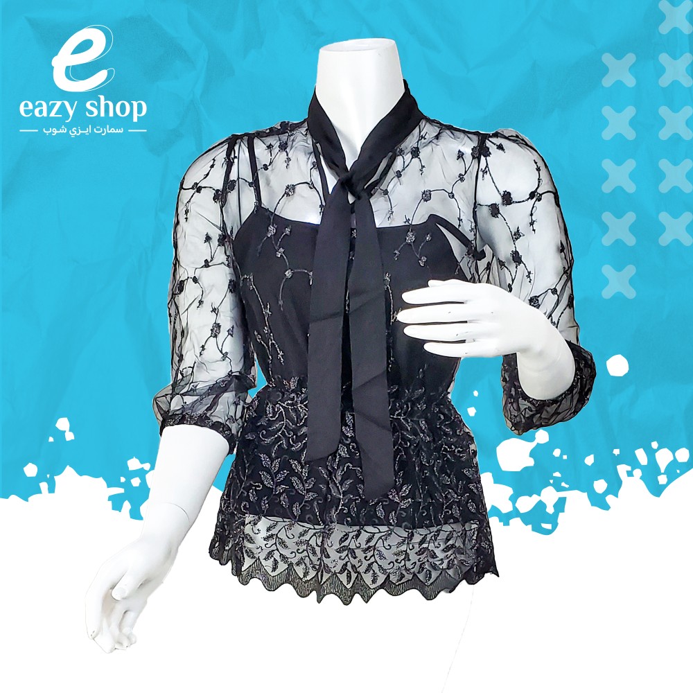 بلوزة نسائي راقي , دانتيل مبطن بقطعة قماش ناعمة , على ياقه بشكل شريطة رفيعه , الصدر والكم دانتيل راقي جدا يضفي لمسة انوثه , الكم شبه مكمم على قبضة ,على الخصر قبضه مطاط مريحة وتعطي للبلوزة من الاسفل شكل جدا جذاب , تتميز بالوانها المختلفة