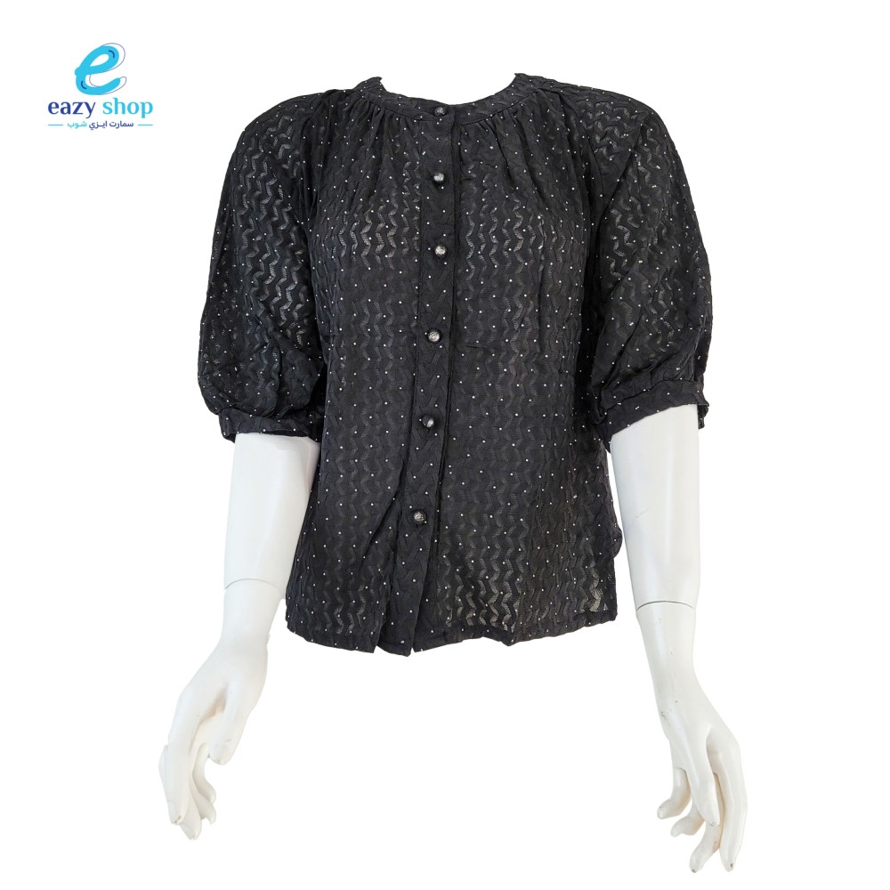 بلوزة فاخرة تجمع بين الاناقة والرقي بتفاصيل ناعمة مصممة بازرار لؤلؤية تمتد من عنق البلوزة وحتى الاسفل تضيف لمسة انثوية ناعمة, مخيطة بشكل تموجات تشبه الجبال بنفس لون القماش لتعطي بعد بصري انيق , موزع عليها فصوص صغيرة جدا بشكل ناعم ولماع يضفي بريق هادئ , الاكمام بطول متوسط تنتهي اسفل المرفق مع لمسة دائرية تمسك الكم وتعطيه شكل انسيابي , مثالية للطلعات والمناسبات , وتتميز بلونيها الابيض والاسود