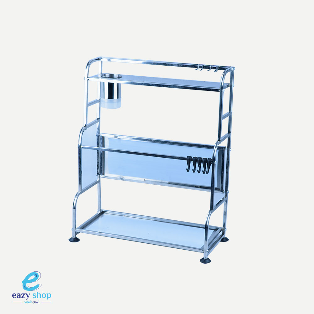 شبك حامل الصحون 4 دور مع كأس لحفظ الاشياء الصغيرة والملاعق كما يحتوي على علاقيات لتعليق ملاعق الطبخ وغيرها من الاشياء.