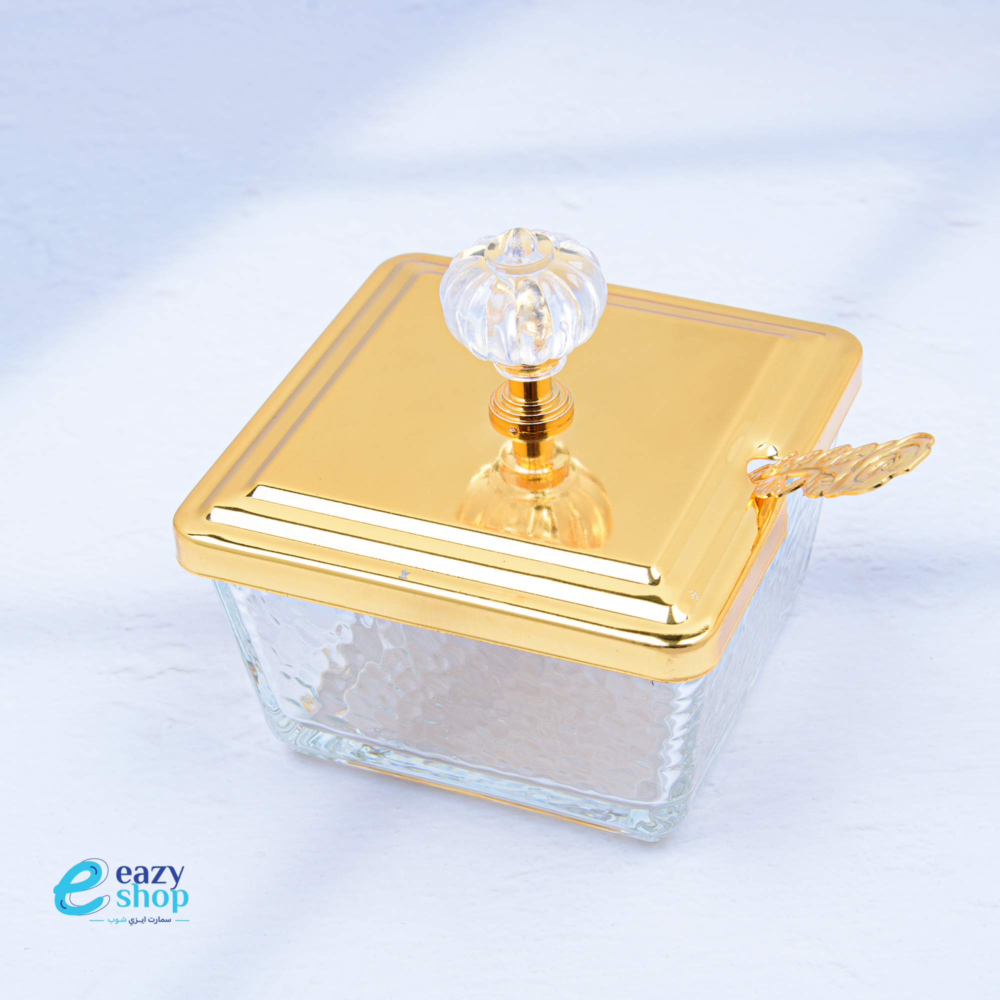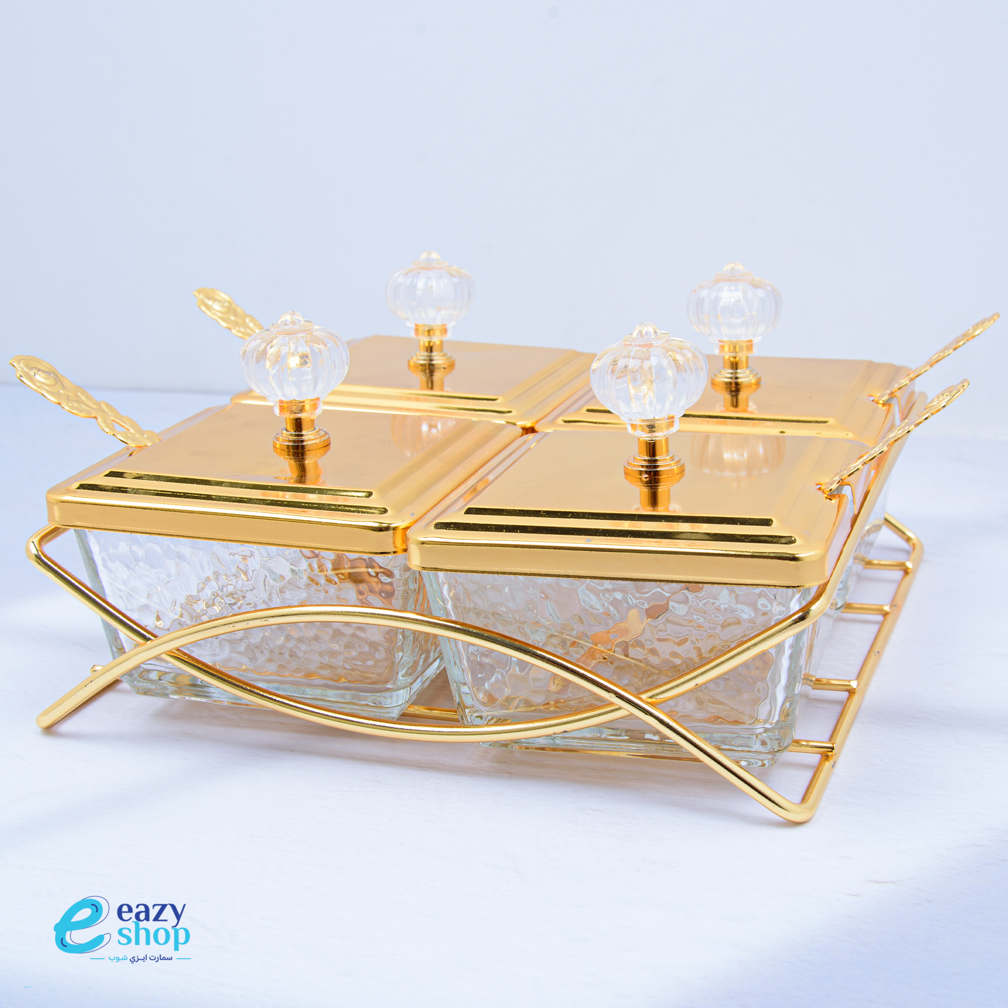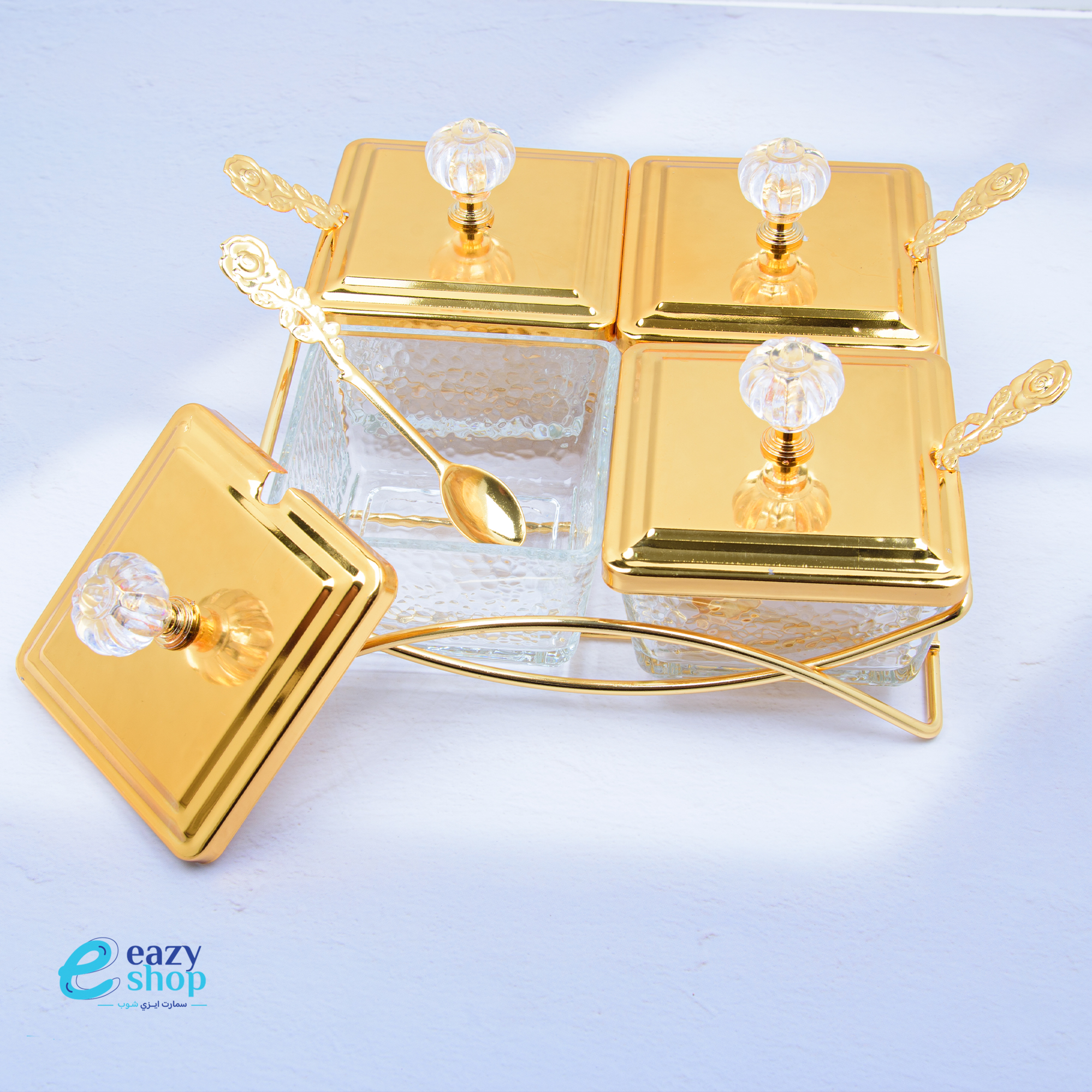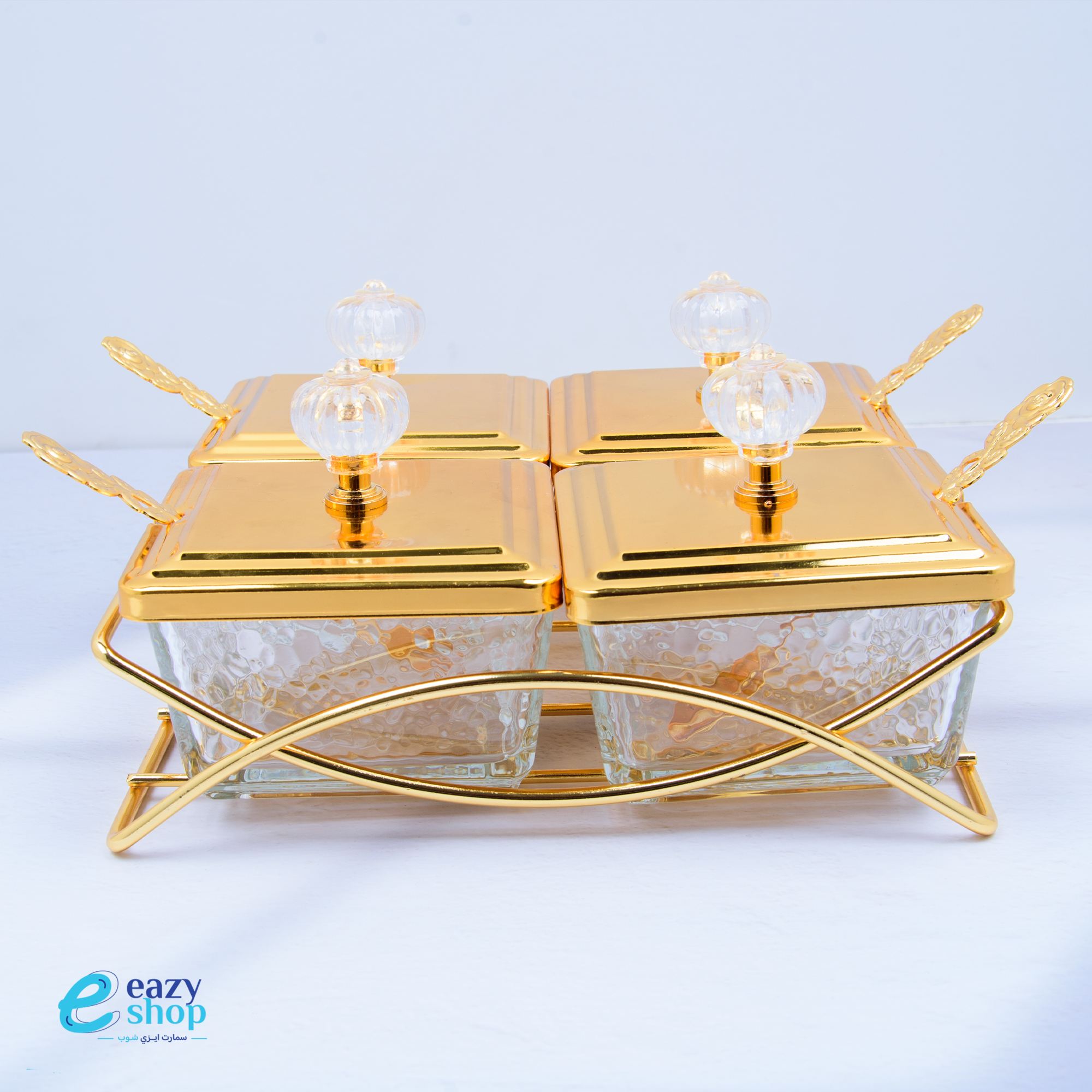 طقم من أوعية تقديم زجاجية مع أغطية وملاعق ذهبية، موضوعة على حامل ذهبي، يمكن استخدامه لتقديم المكسرات أو الحلويات أو المقبلات.