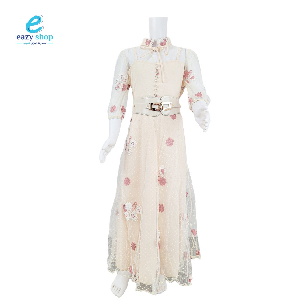 فستان بناتي راقي وعصري مميز على ياقة مع خيوط رفيعة على الكتفين تضيف لمسة ناعمة في اسفل الرقبة مع الكم مصنوع من الشبك الانيق مما يضيف جاذبية خاصة , اكمام شبك متوسطة الطول على قبضة , اضافة الى حزام جلد على الخصر يبرز جمال التصميم ويتميز بالوانه المتعددة