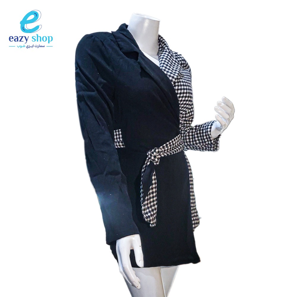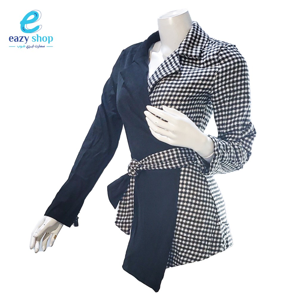 كاروهات انيقة ذات قصة اكثر تميز بشكل كوت , بتصميم نصه لون احادي والنصف الاخر متداخل بشكل هندسي ( مربعات صغيرة ), على ياقة تضيف للموديل اناقة اكثر , مكمم , على ربطة اختيارية في الخصر تضيف لمسة انثوية وتعطي قوام مميز