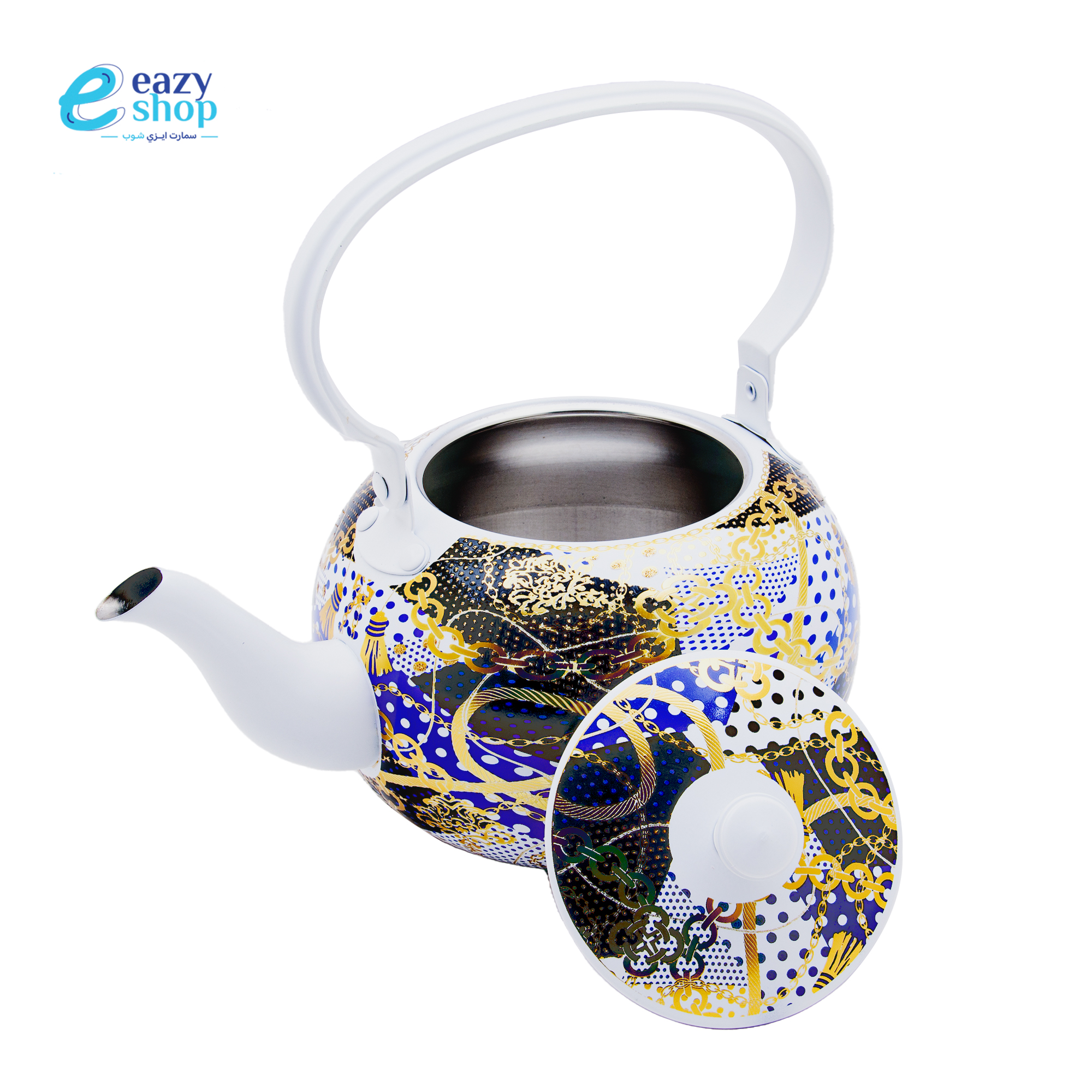 يتميز بتصميم مزخرف باللونين الأزرق والذهبي، ومقبض علوي من الستانلس ستيل.